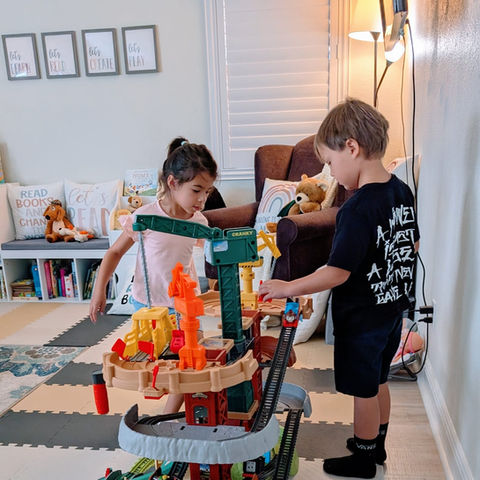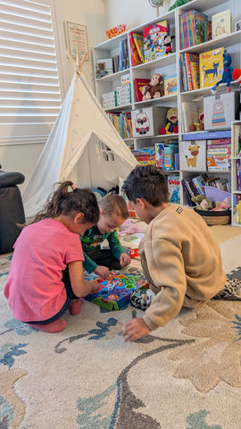 Inviting playroom with a cozy reading teepee and corner, shelves of books, and plenty of toys and activities! Everything kids need for imaginative play and quiet, comfy downtime.